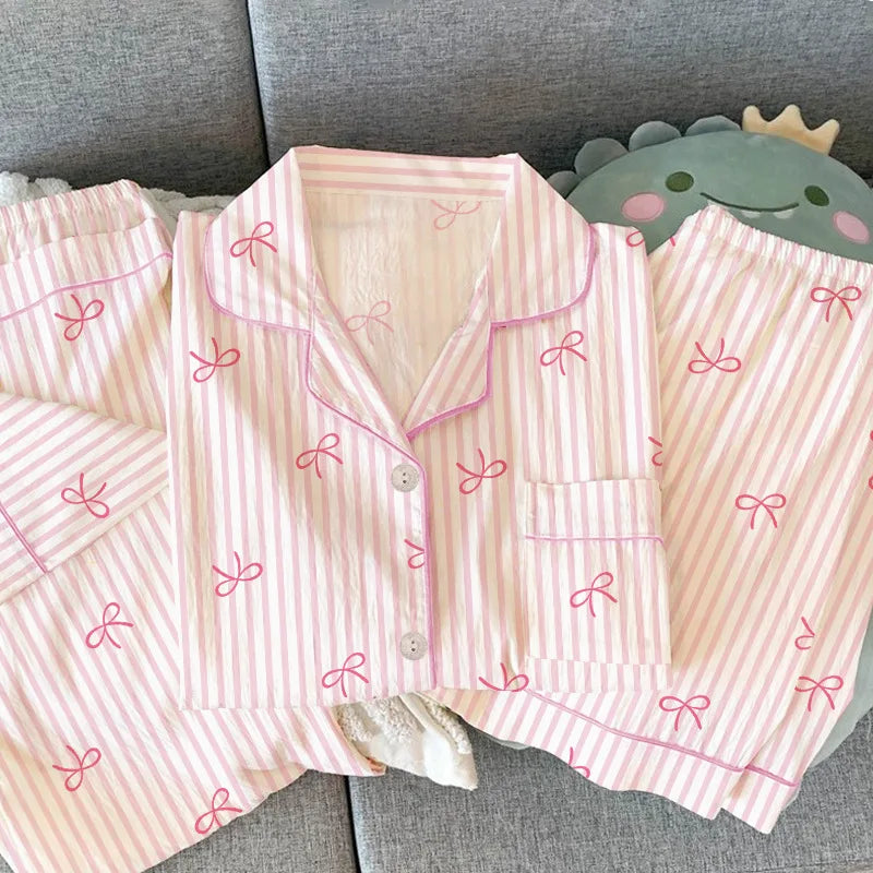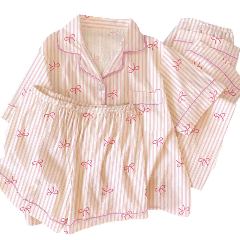 Women Summer Pajamas Three-piece Set Leisure Sleepwear Short Sleeve Lapel Sweet Bowknot Striped Print Homewear Female Loungewear